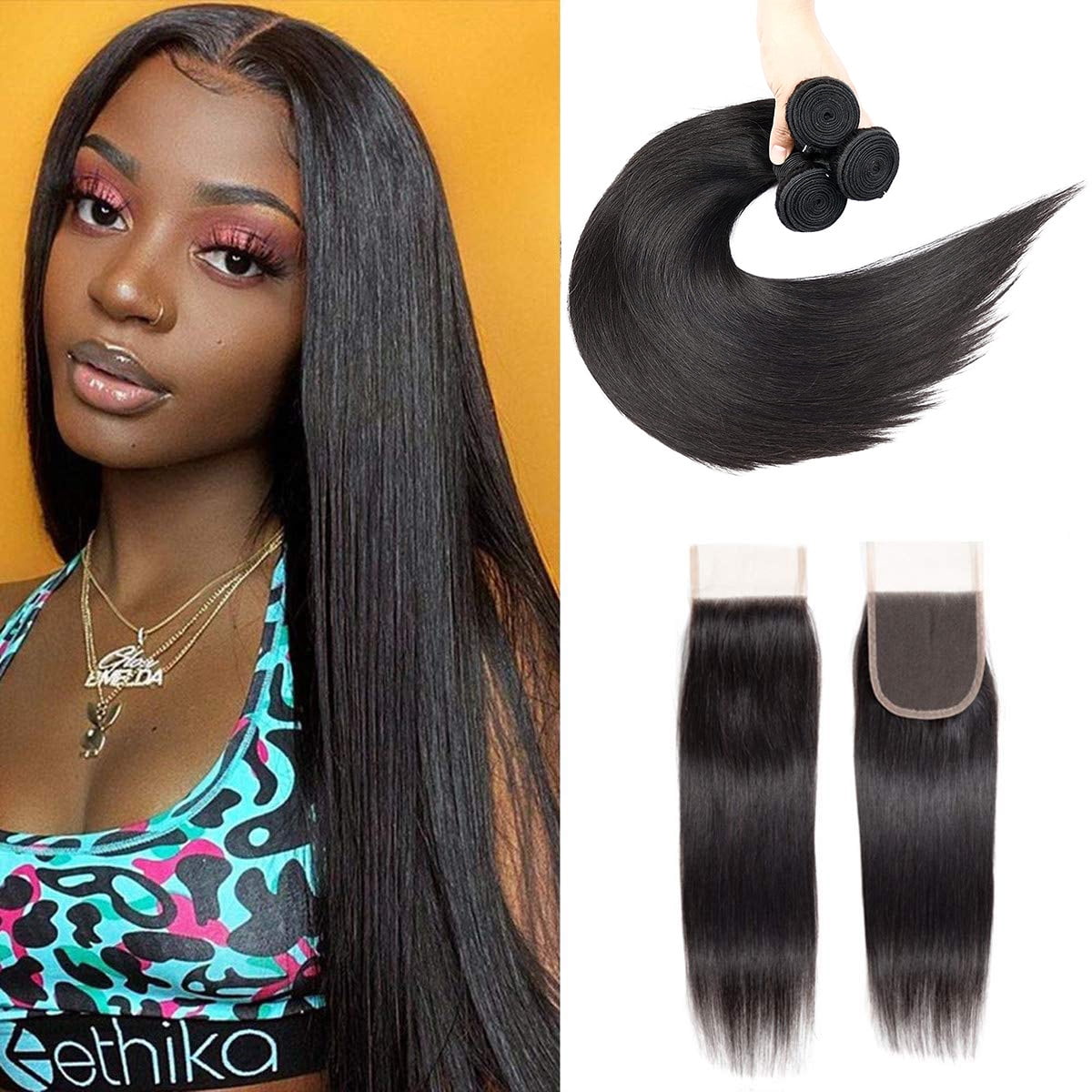 Straight Hair Bundles With Closure 100 Human Hair Bundles 3 Bundles With 4x4 Lace Closure Free Part 1b Natural Black Color Walmart Com